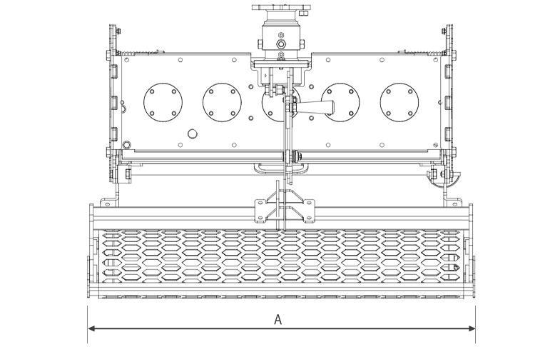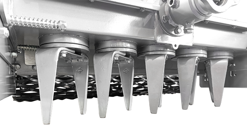 • Rullo posteriore a rete in acciaio: supportato da cuscinetti lubrificati a grasso e regolabile in altezza tramite leva a cambio rapido.